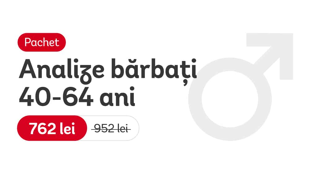 Pachetul de analize pentru bărbați cu vârsta între 40 și 64 de ani este conceput pentru monitorizarea completă a stării de sănătate într-o perioadă în care riscurile metabolice, cardiovasculare și prostatice pot crește.