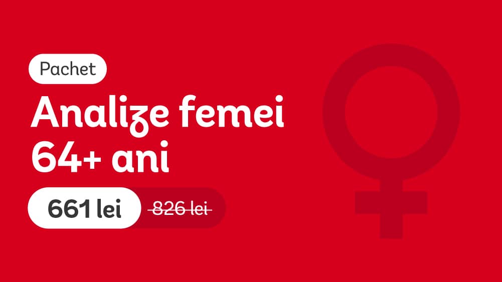 Setul de analize pentru femei cu vârsta de peste 64 de ani este conceput pentru monitorizarea atentă a stării de sănătate și pentru depistarea timpurie a afecțiunilor care pot apărea odată cu înaintarea în vârstă.
